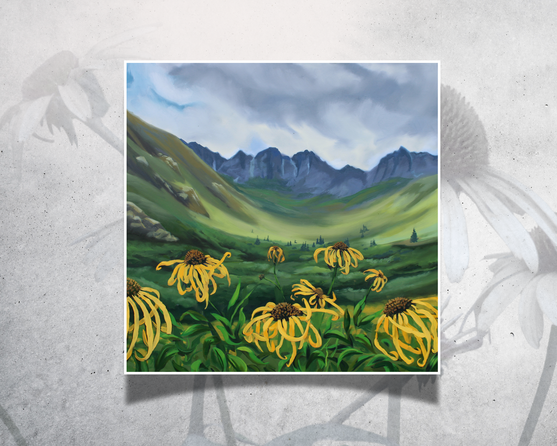 A painting of American Basin: the base of Redcloud, Sunshine, and Handies Peaks, often blanketed by strange, dancing cone flowers.